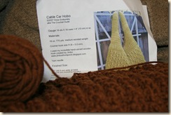 So.... I subscribed to a bunch of crochet sites, cuz I really need the inspiration. Guess what? I got it! I came across a blog entry from "The Crochet Dude" as he had posted his latest patter, the Cable Car Hobo bag. I LOVE IT! I purchased it online and have been working feverishly on it ever since. I have taken it everywhere with me, even into Dennys! I have the bag rectangle finished and have folded it in half and have whip-stitched the sides. I'm getting ready to start the handles. I'm so excited about it.
