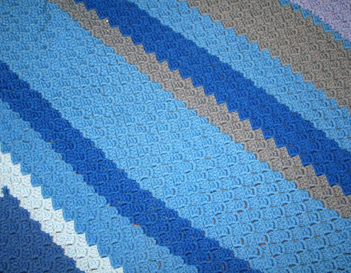 I finished my corner to corner afghan that I had been making for Cassie! I think it turned out very nice. I made it to throw over the couch cushion because that is where she likes to nap. I discovered this pattern because my Aunt Frannie always uses this pattern when making afghans for new babies because it is soooo easy to work up and makes a nice square. She made one for Liam and I loved it. So, I googled and googled until I found the pattern. I finally found it on a blog called Anastacia's Knits. If you look closely you will see that the pattern is a series of diagonal shells. It really does work up fast and is super easy, it is one of those patterns where you don't have to think or count, you just go to town. Then when you get to the diagonal length you want, you begin